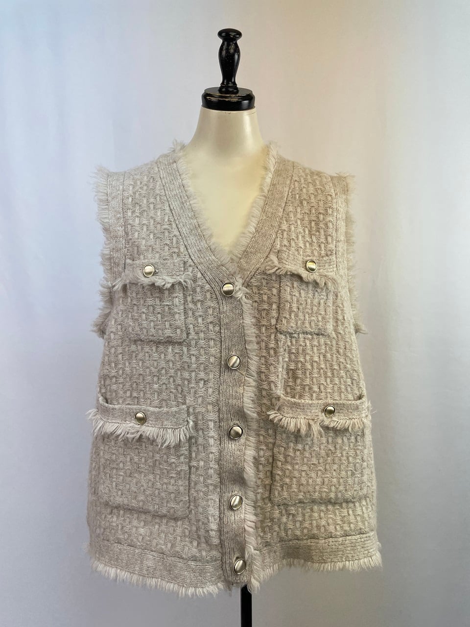 ふくらみのあるMIXカラー糸を使用し、ツィードのような表情と柔らかな手触りを両立。フリンジ仕様やゴールドボタンなどディテールにもこだわり、華やかで上品な仕上がり。