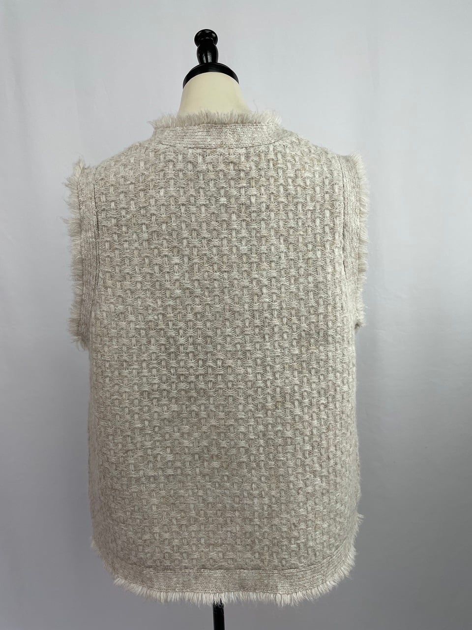 衿ぐりや裾の端始末はフリンジ仕様で華やかさをプラス。お尻が隠れる長めの着丈とVネックデザインで抜け感のある印象に。ゴールドボタンがアクセントになり、程よくゆったりとしたシルエットでレイヤードスタイルも楽しめる一枚です。