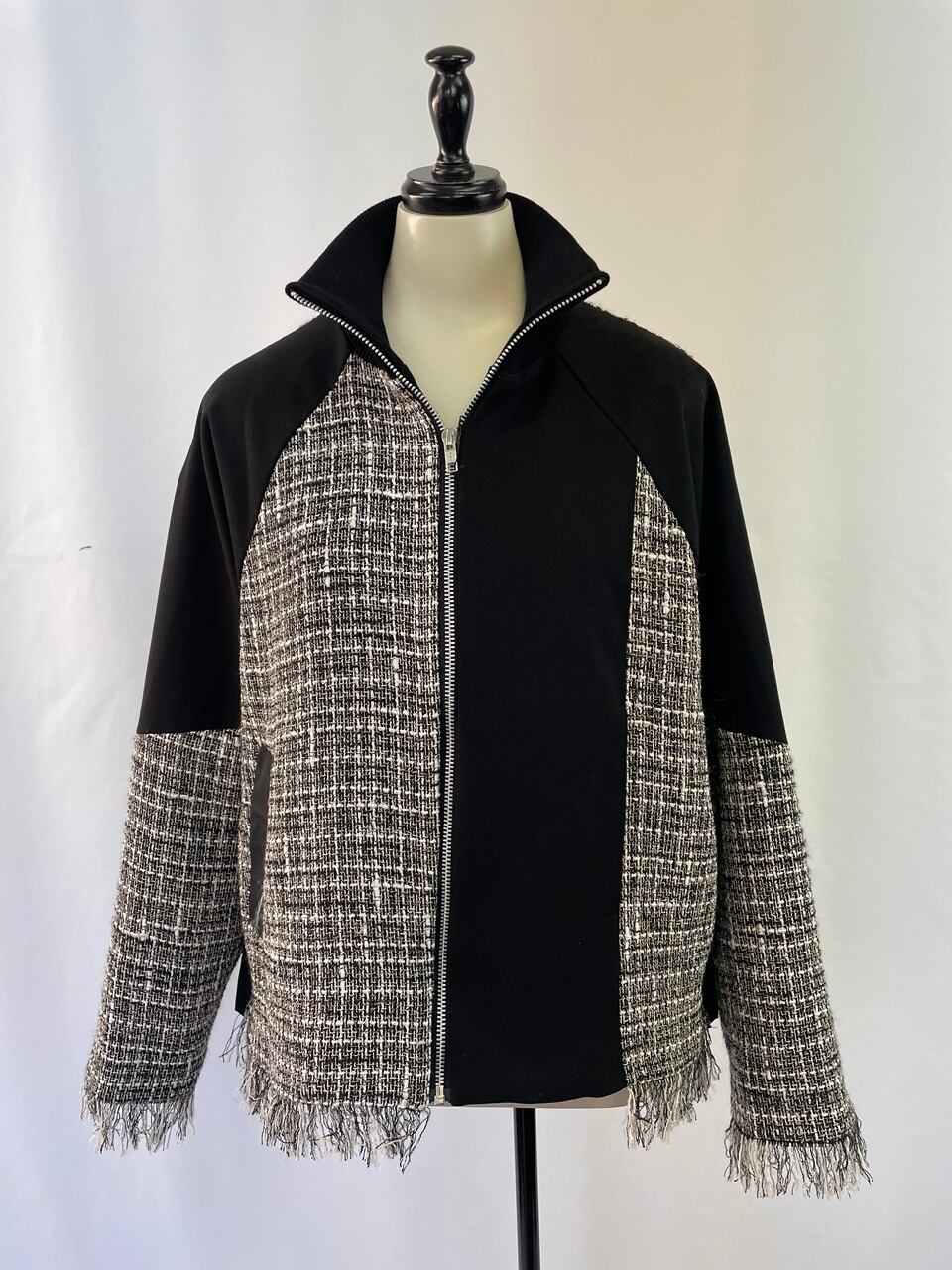 袖口、前裾、ヨークのツイード下端はフリンジになっているのがアクセント。