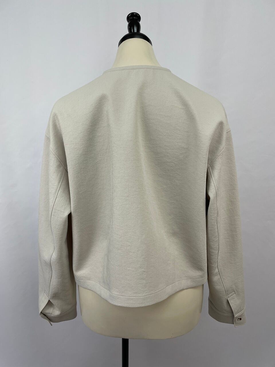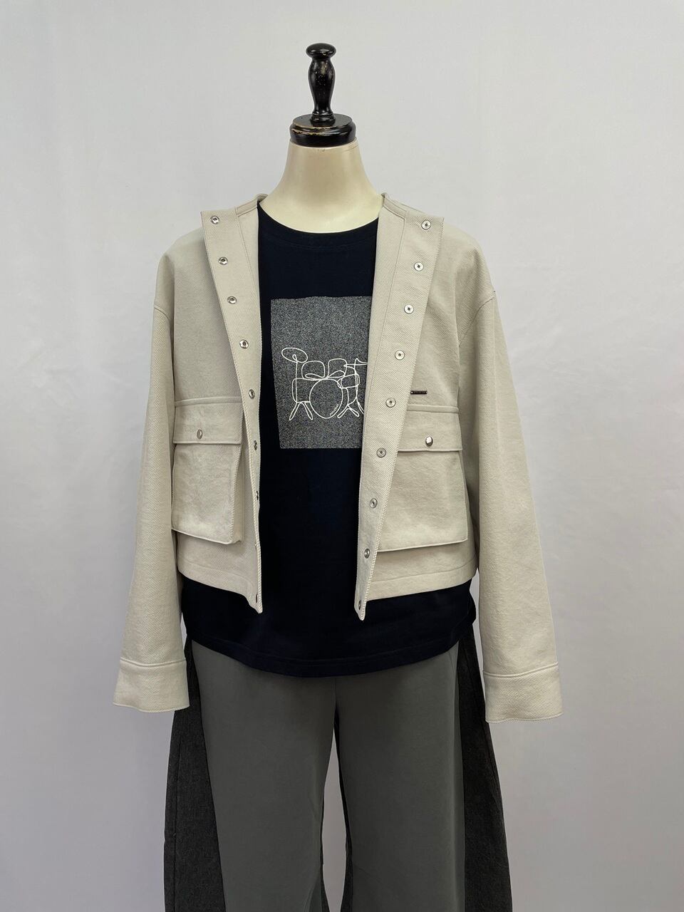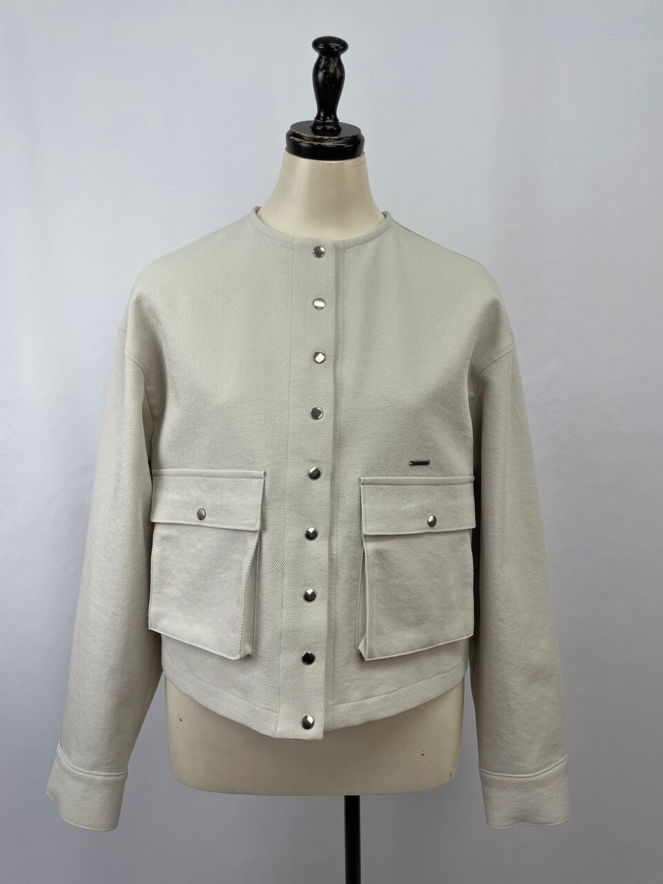 丸首と比翼ボタンのすっきりとした前立てに、大きめのフラップポケットを配したボックスシルエット。
