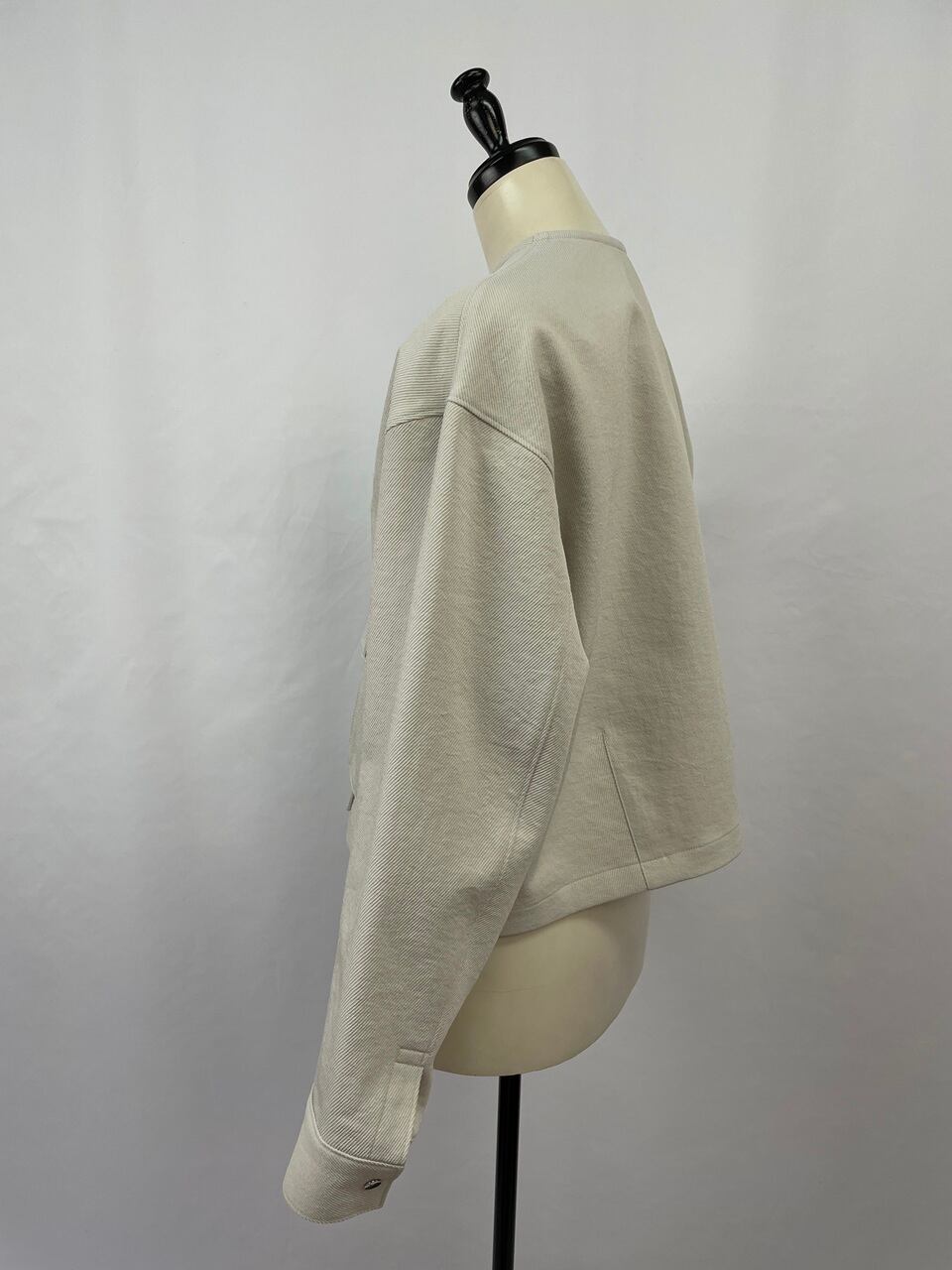 短めの着丈で腰まわりが整い、重ね着しやすく体形をさりげなくカバーします。