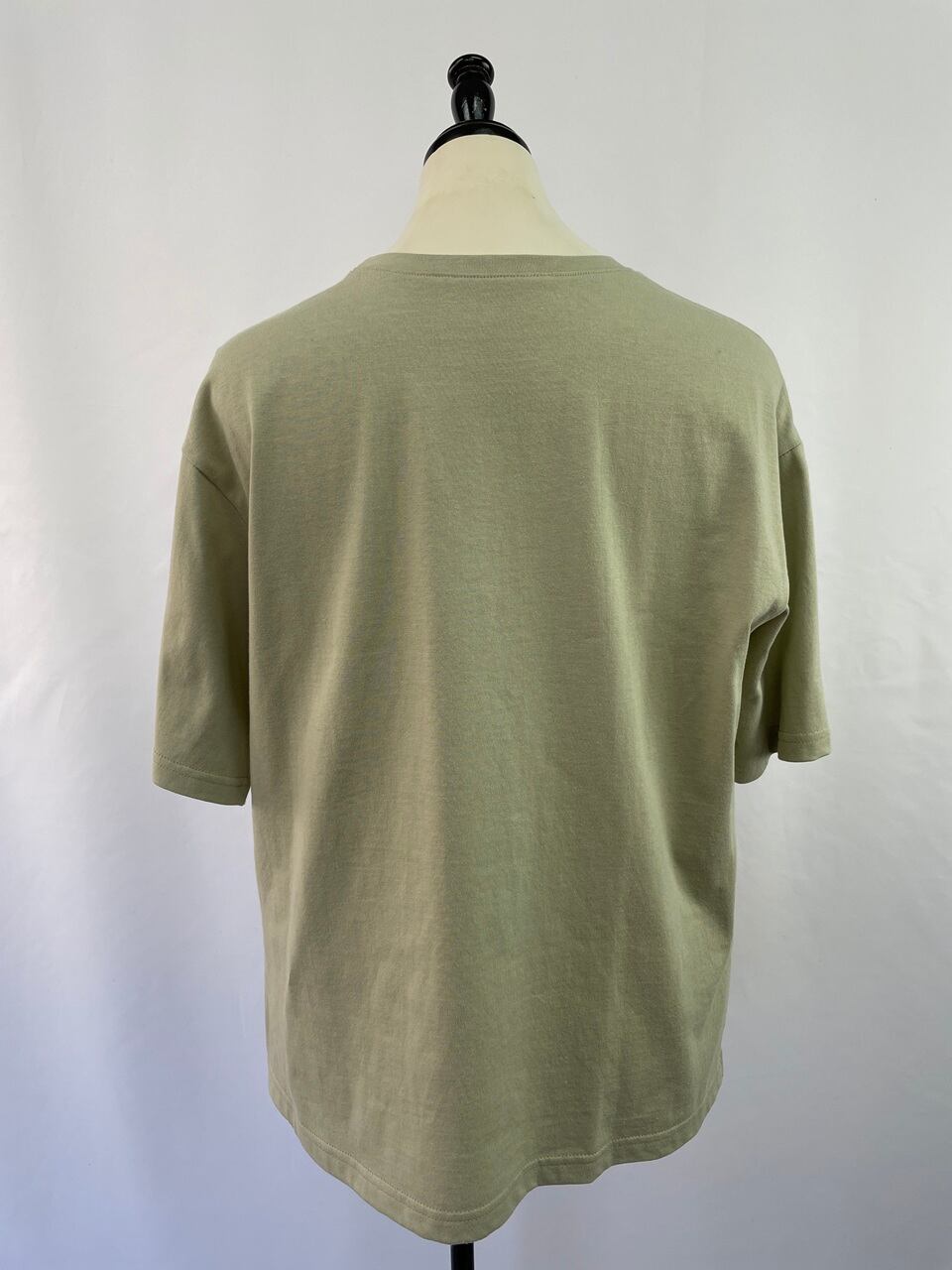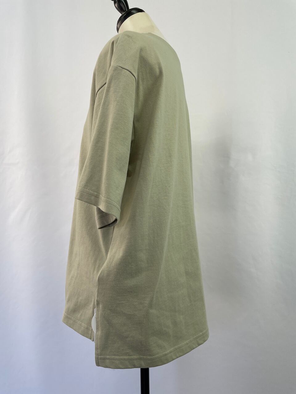 開きすぎず詰まりすぎずなネックには同生地を使用し、細めの幅にすることでTシャツ特有のカジュアルさを抑えたキレイ目な印象に。