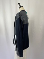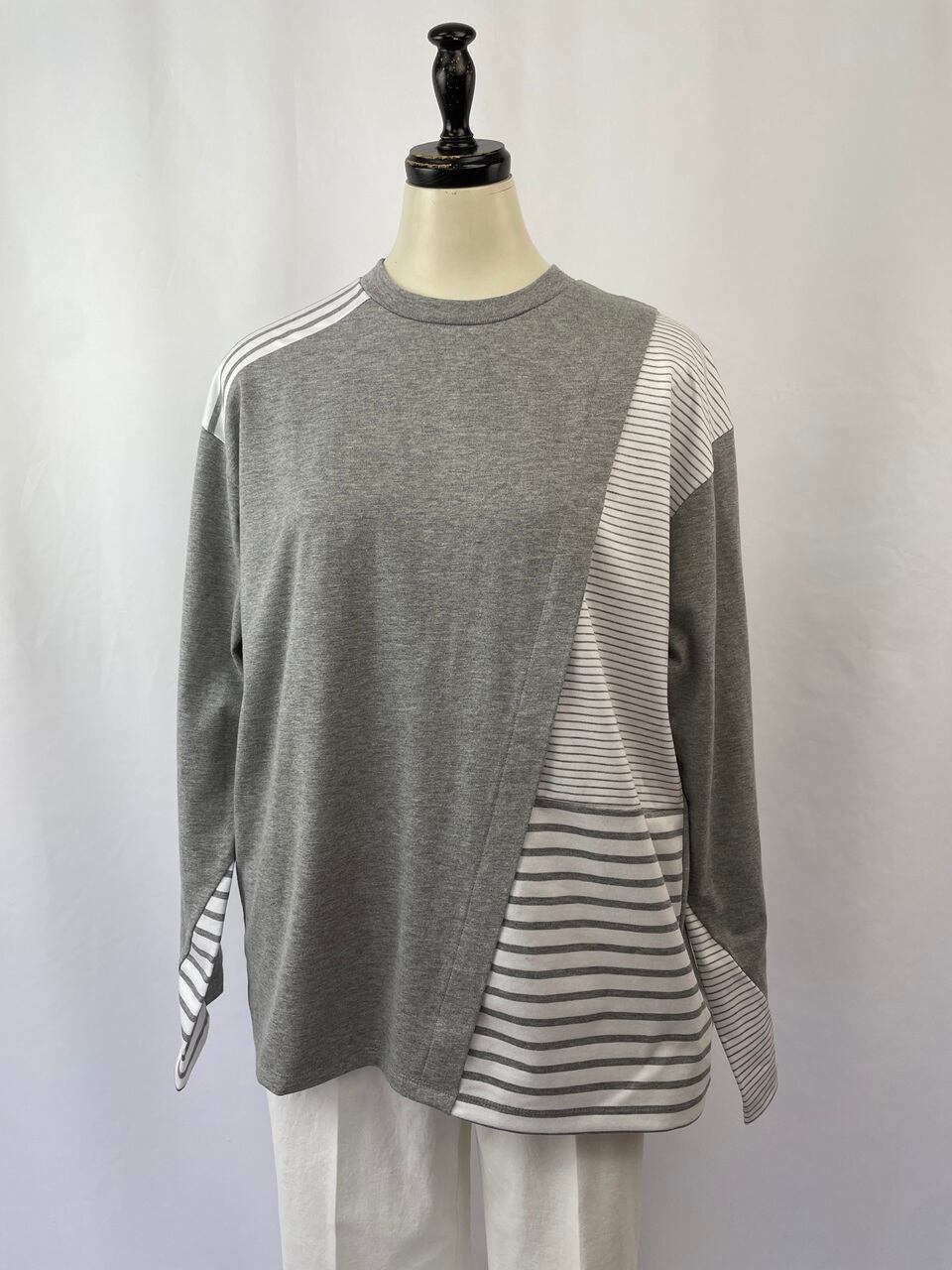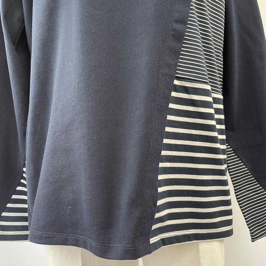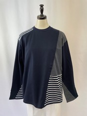 身頃にコンビネーションしたボーダーはパーツによってピッチが異なり、袖口のスリットから覗くアシメボーダーが遊び心をプラス。