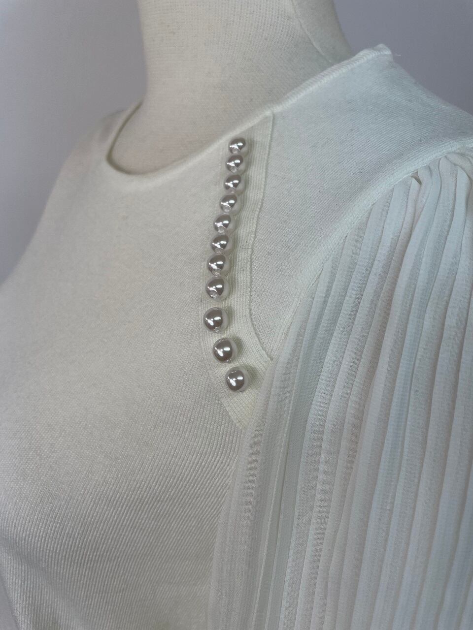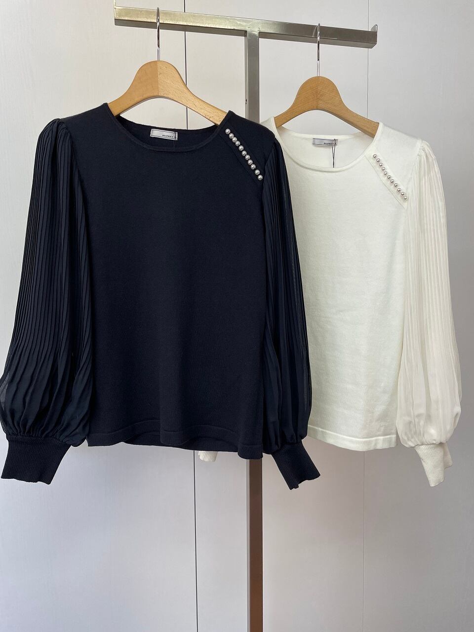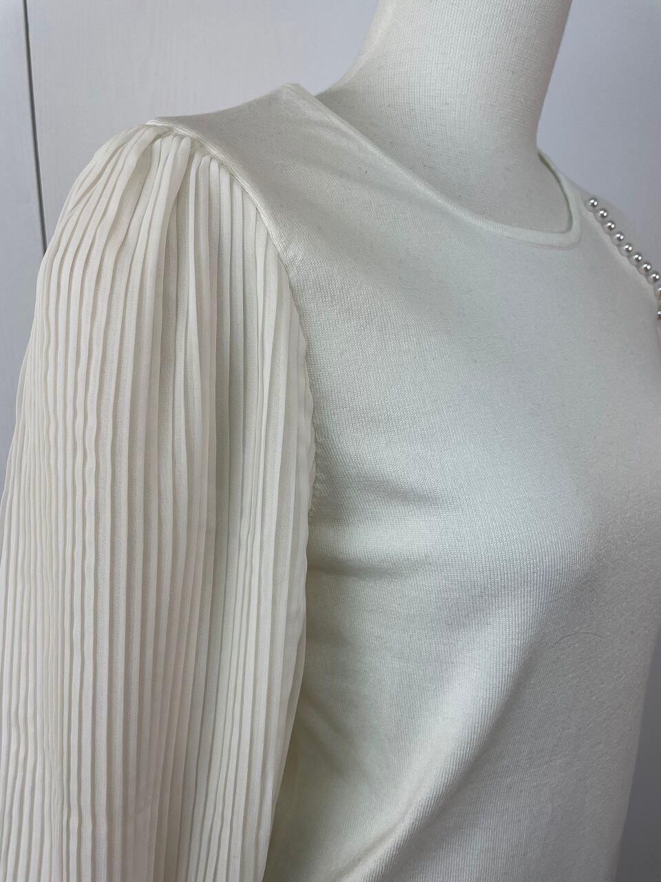 布帛のプリーツスリーブとパールを組み合わせた女性らしいアイテム。