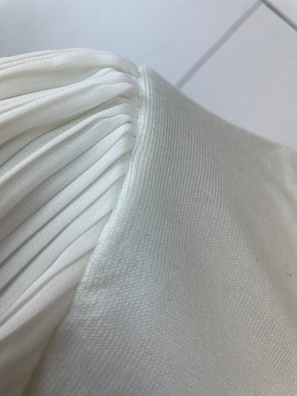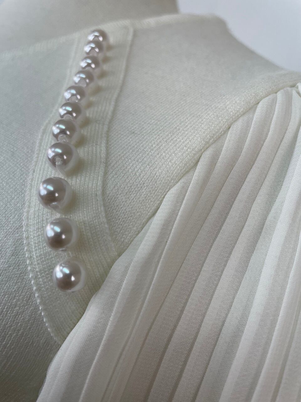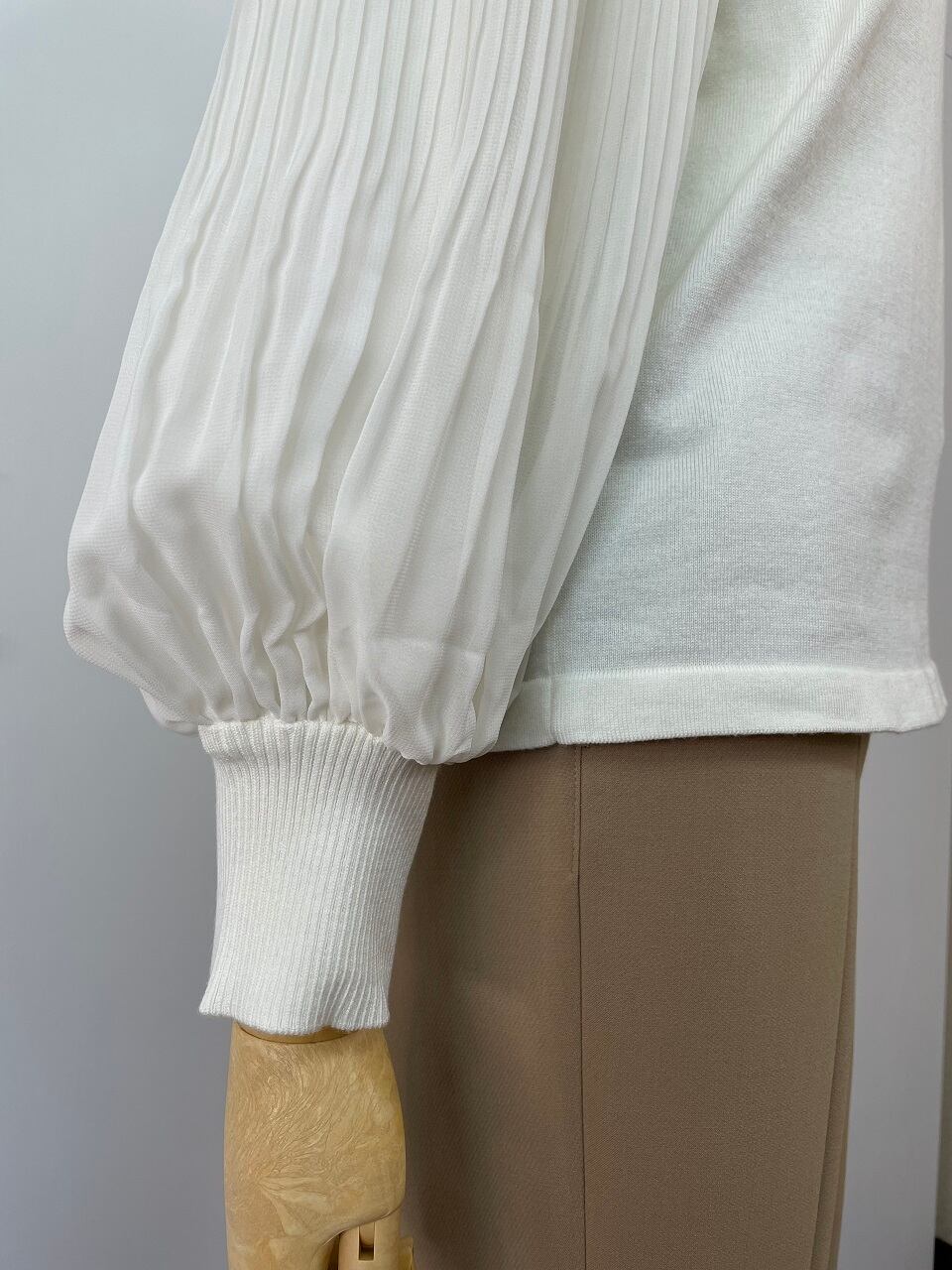 布帛のプリーツスリーブとパールを組み合わせた女性らしいアイテム。