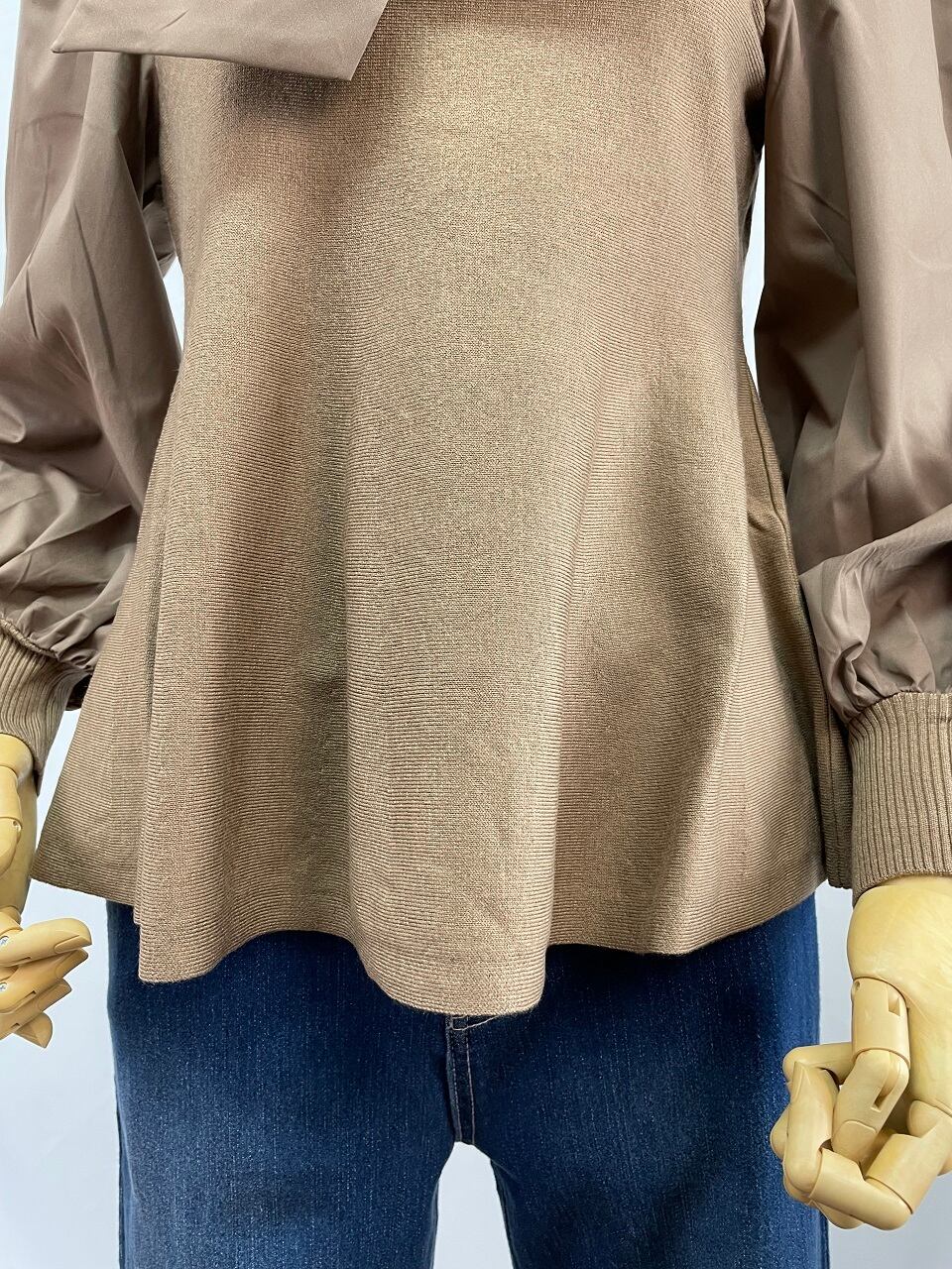 ボウタイブラウスとニットが異素材コンビになった上品なプルオーバーです。
