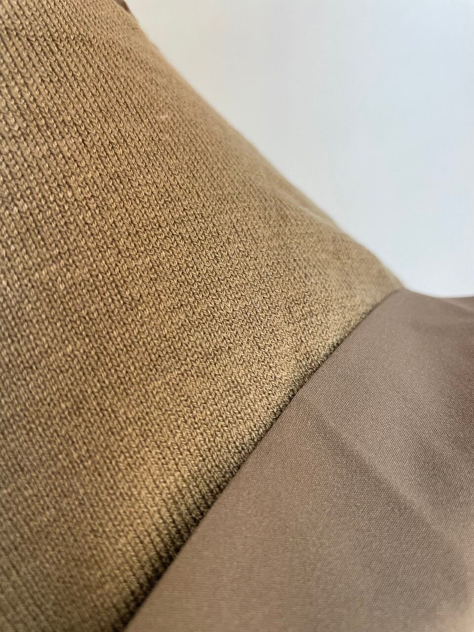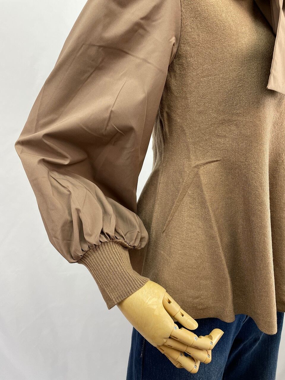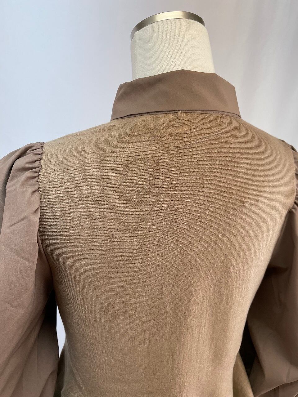 タフタとニットのコンビネーショントップス。