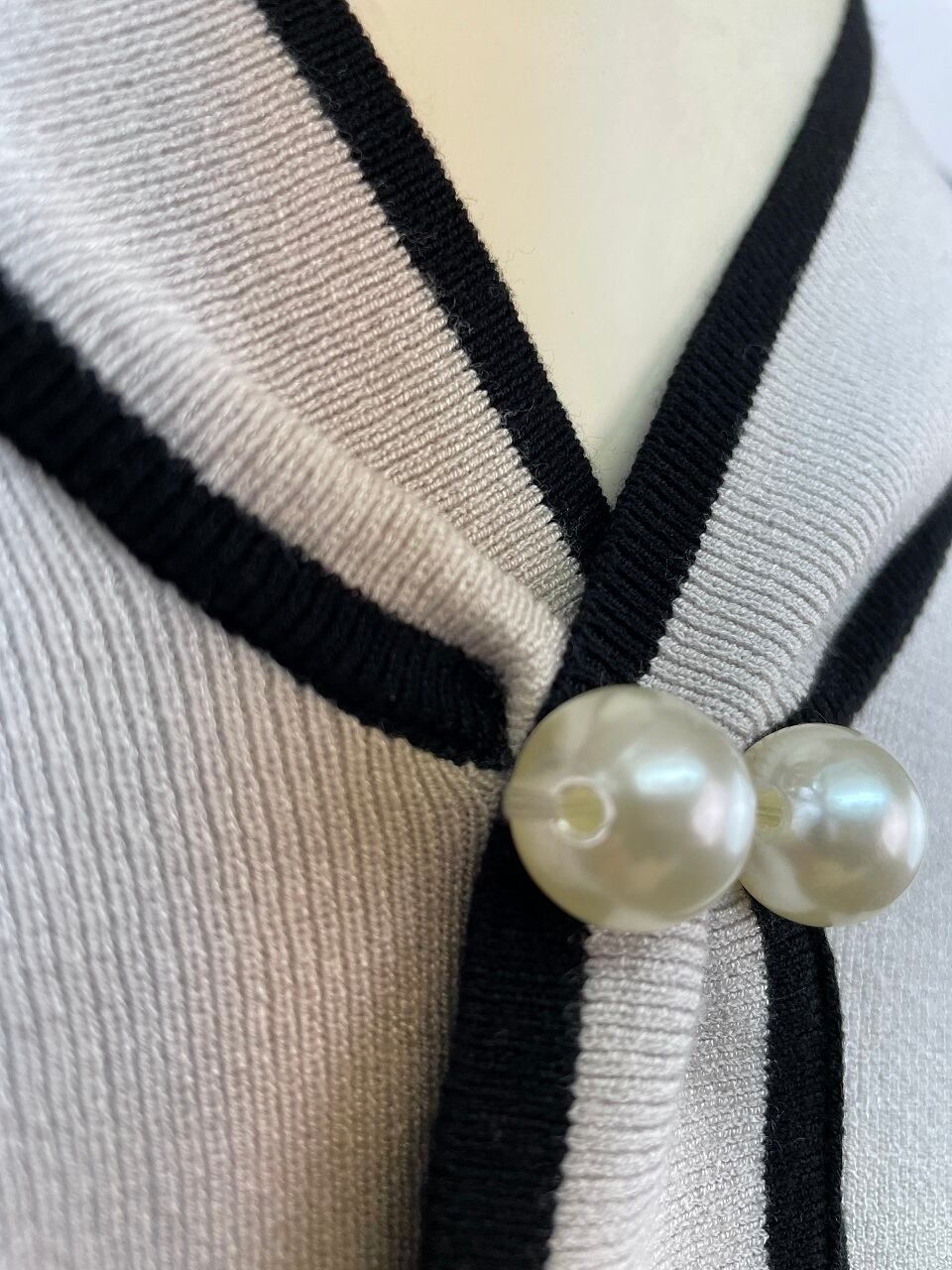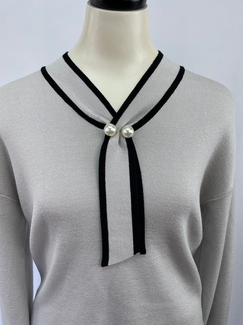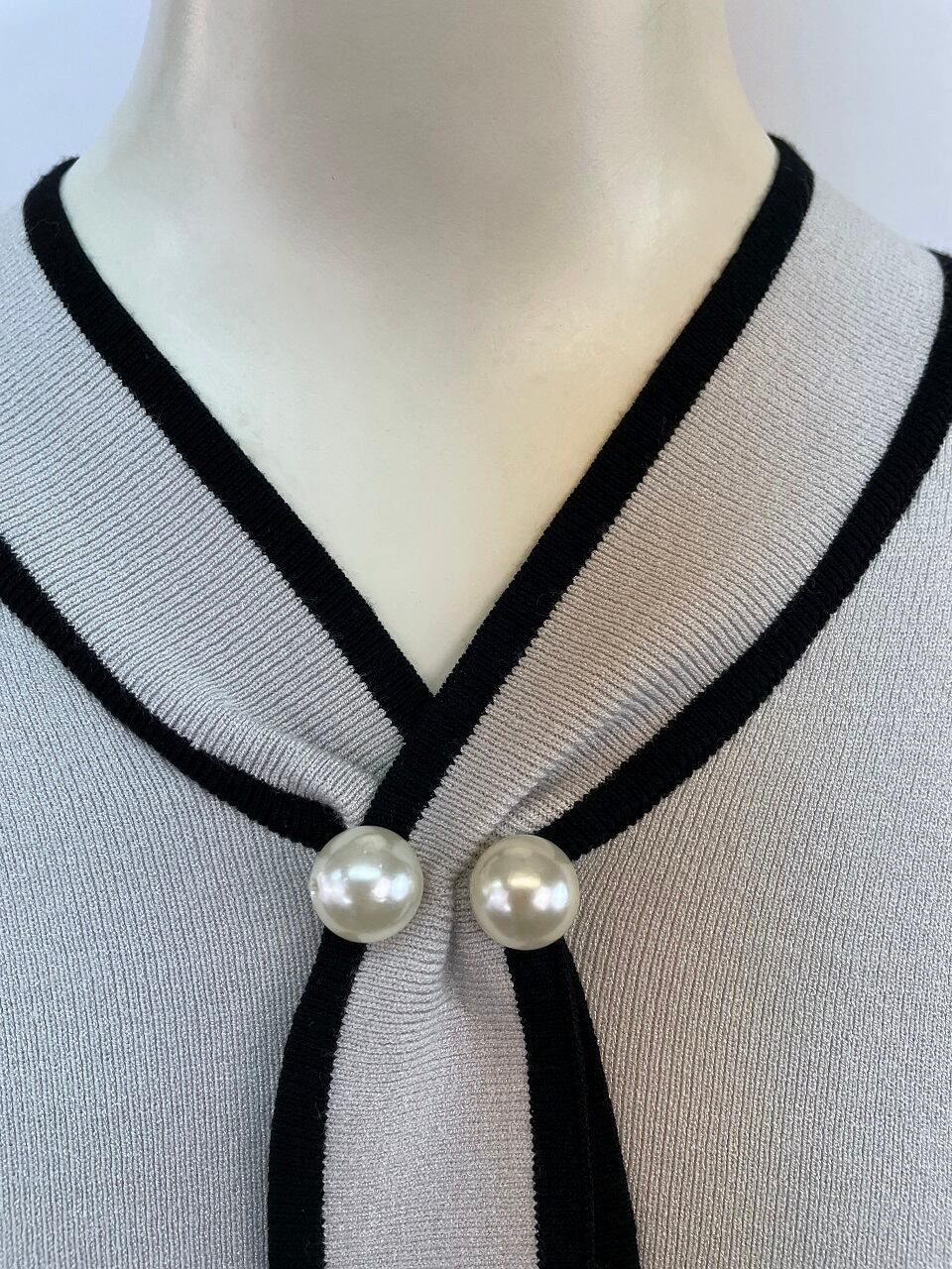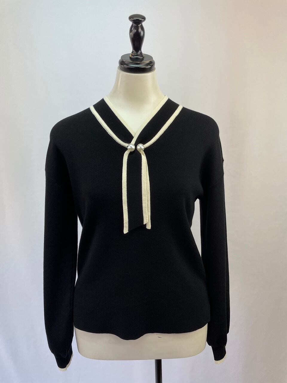トレンドのボウタイにパールを施したデザインは、一枚でお出かけはもちろんジャケットやアウターのインナーにも相性抜群です。