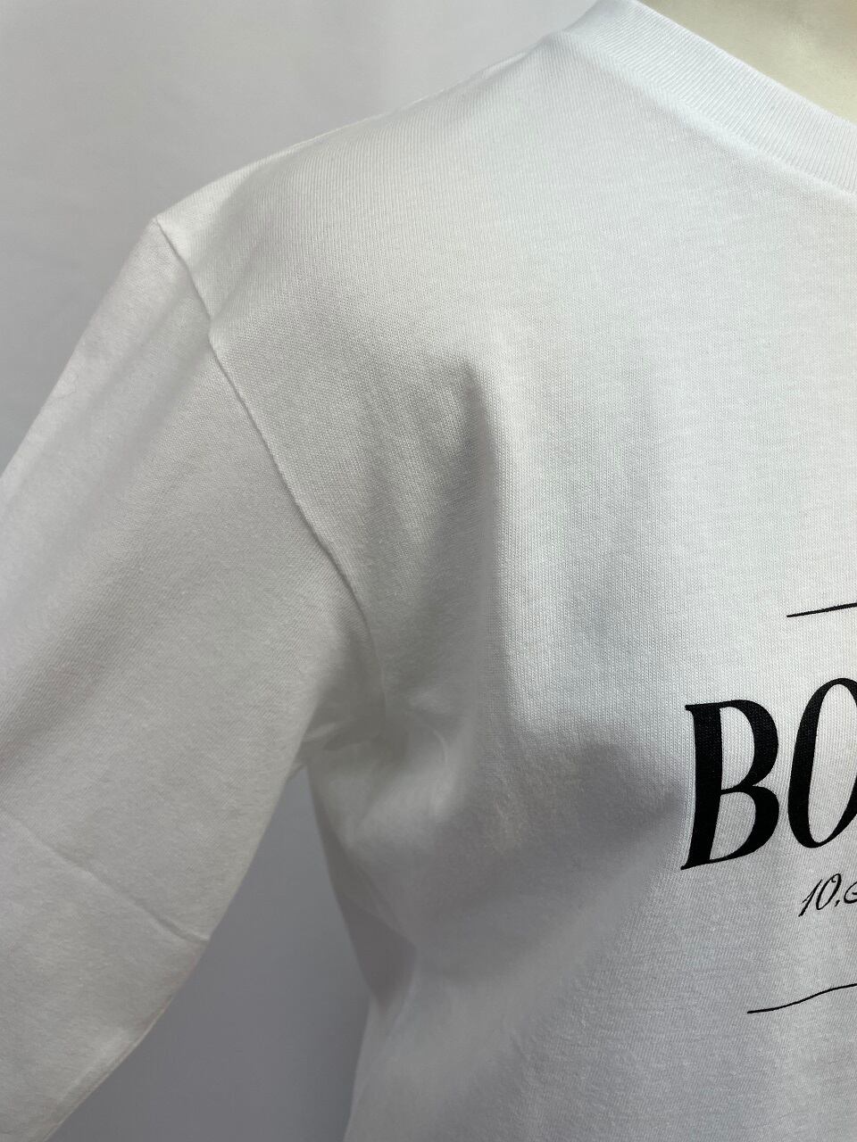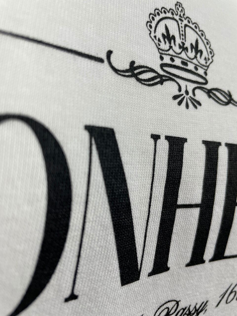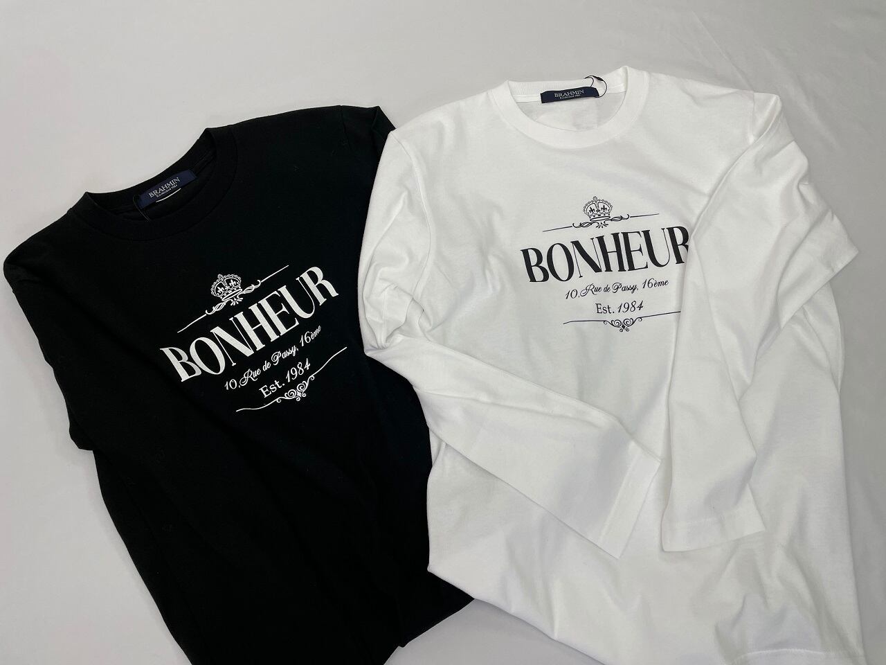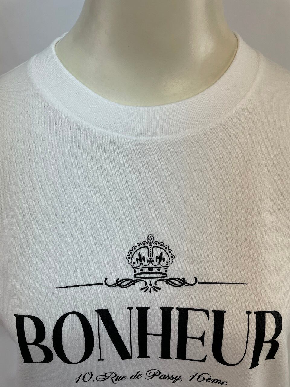 前身頃にプリントされているロゴはフランス語で「幸せ」と「パッシー通り10番地16区」を組み合わせたものです。